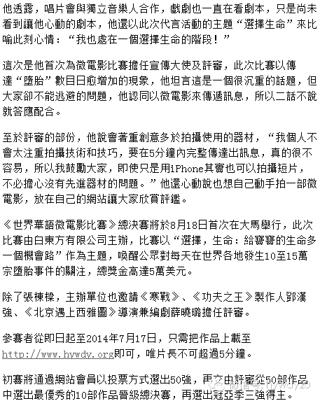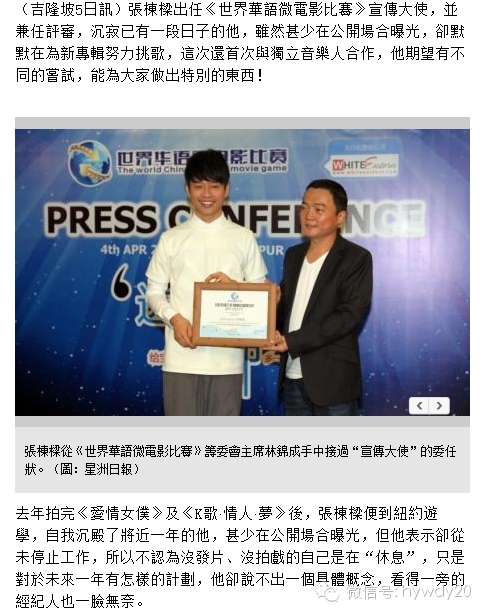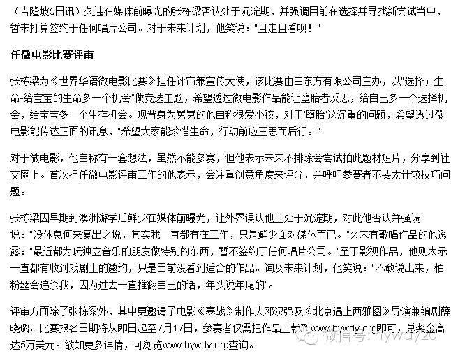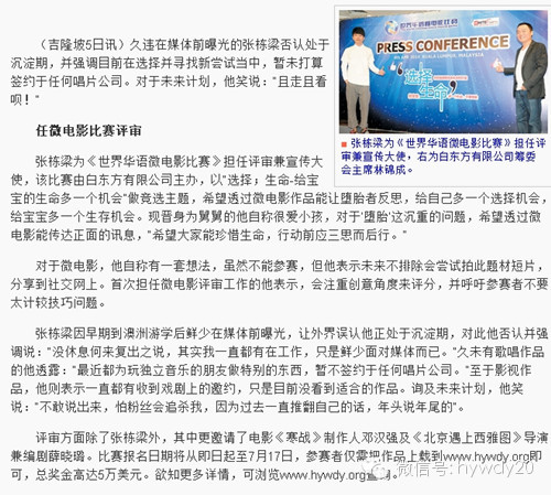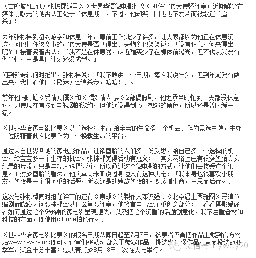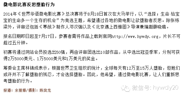 自世界华语微电影比赛准备筹办以来,一直得到各界的支持。通过大家的努力,还有名人的加入让现在的世界华语微电影比赛变成了一个焦点,变成一个故事的集聚地。此次比赛活动筹备的艰辛,以及以及一步步走来所获得成绩一天比一天之大,事实也证明了世界华语微电影比赛的正确性和影响力,保护小生命是件大事,全世界都应该关注。而每一步成功,每一点收获,都要与大家共同分享。